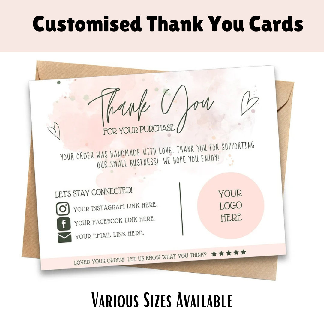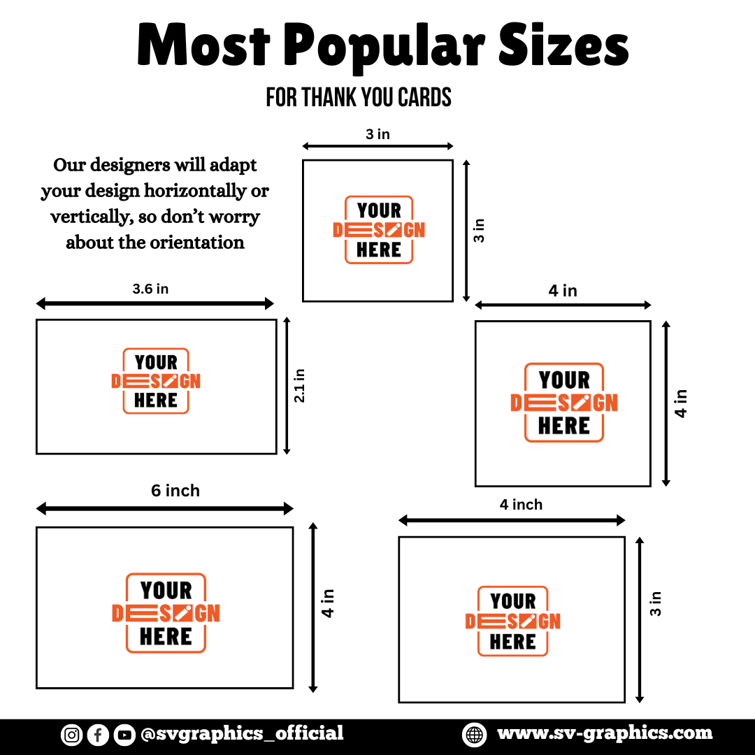 We offer thank you cards in five sizes: 3.6" x 2.1", 3" x 3", 4" x 4", 6" x 4", and 3" x 4". If you require a custom size, feel free to contact us for more information.
